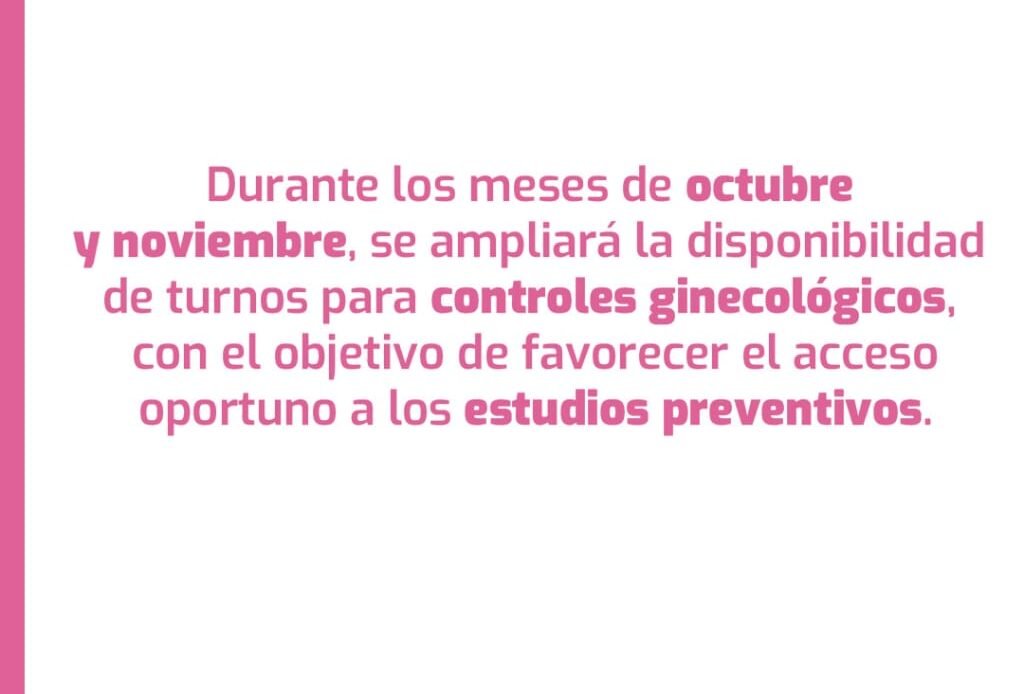 Además, en los centro de atención primaria de la salud municipal «Ramón Carillo», durante los meses de octubre y noviembre se amplía la disponibilidad de turnos para controles ginecológicos, facilitando el acceso a estudios preventivos.