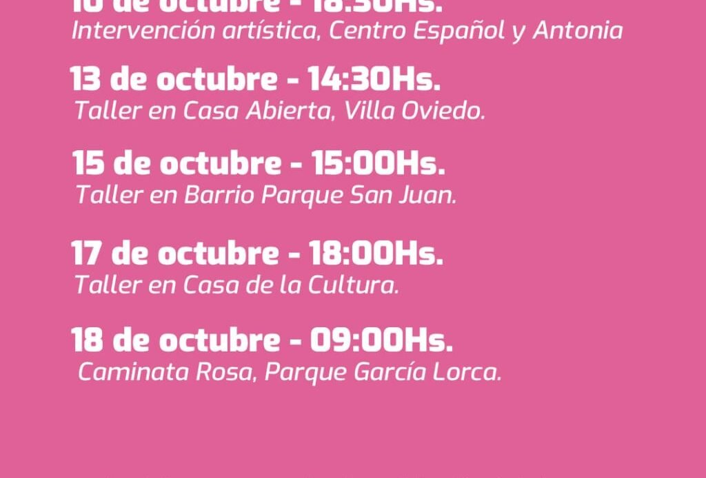 Las actividades se llevarán adelante desde el 13 hasta el 18 de octubre. Se estarán brindando talleres con información importante sobre detección temprana, la importancia de los estudios médicos rutinarios y además, el paso a paso sobre cómo auto controlarse. Estas charlas se realizarán con el acompañamiento de profesionales del área de salud del municipio.