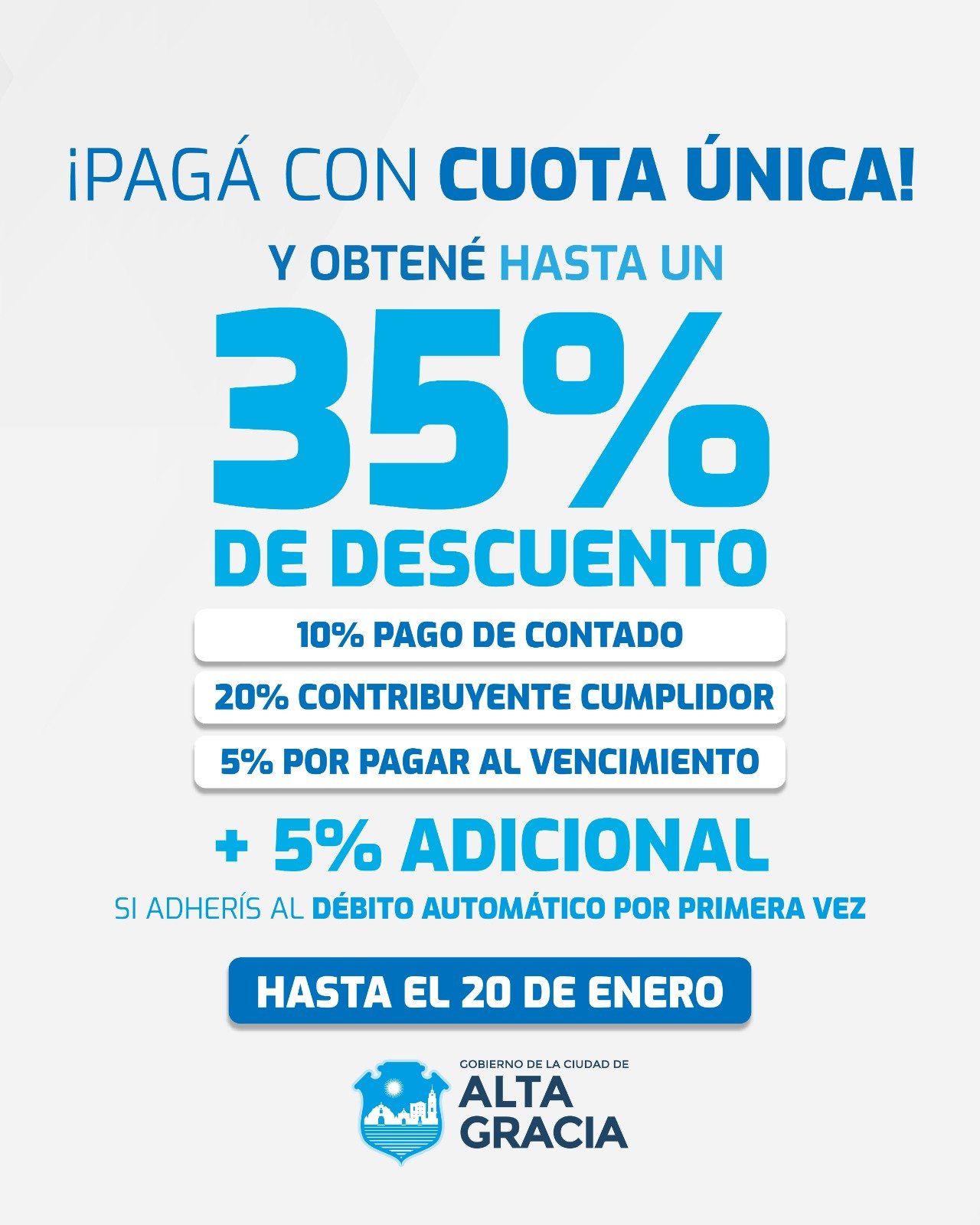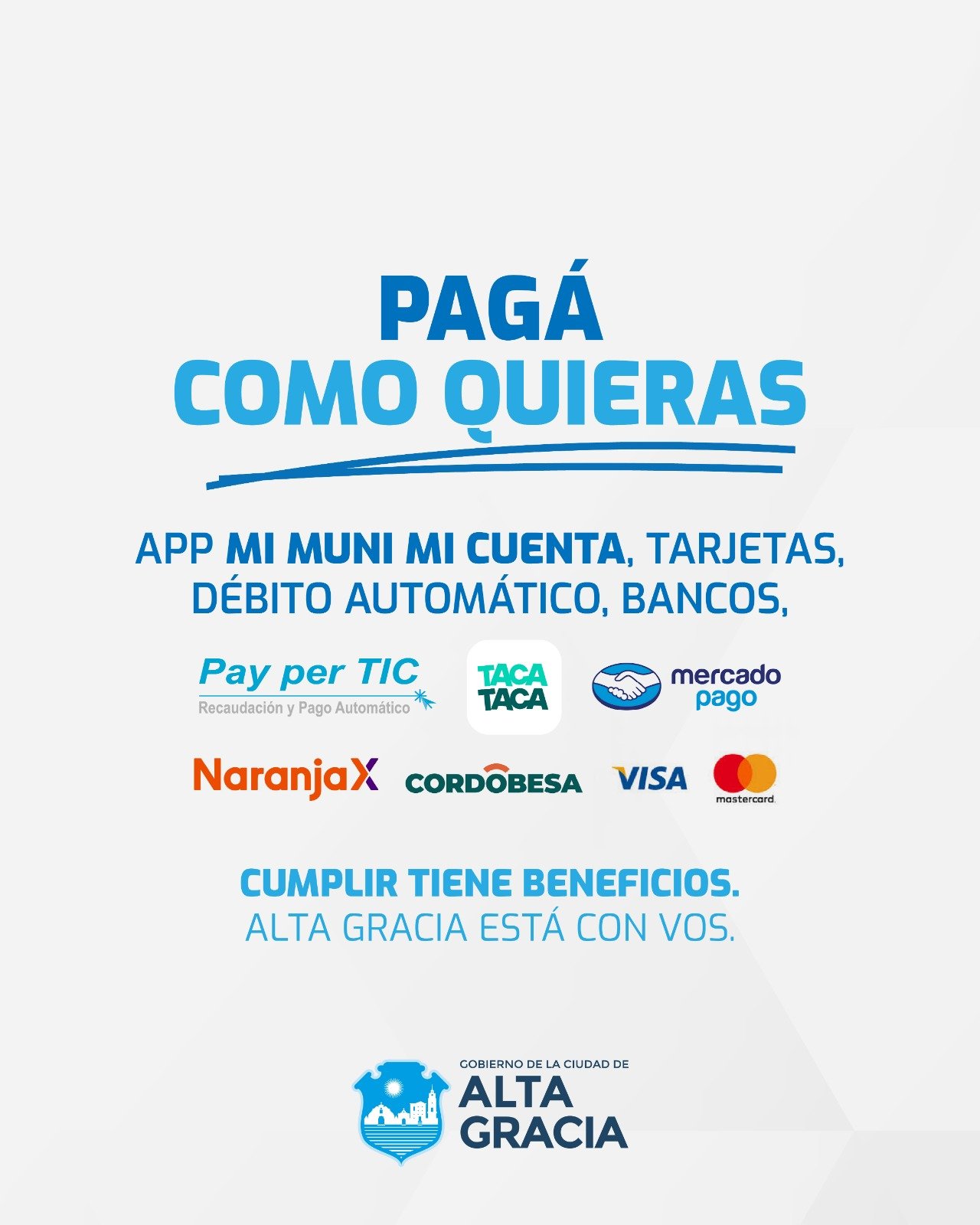 La Dirección de Ingresos Públicos del Gobierno de Alta Gracia informa que, a partir de este viernes 2 de enero, se encuentra habilitado el pago de las tasas por Servicios a la Propiedad, Automotor y Cementerio correspondientes al período 2026, pudiendo acceder a distintos beneficios.
